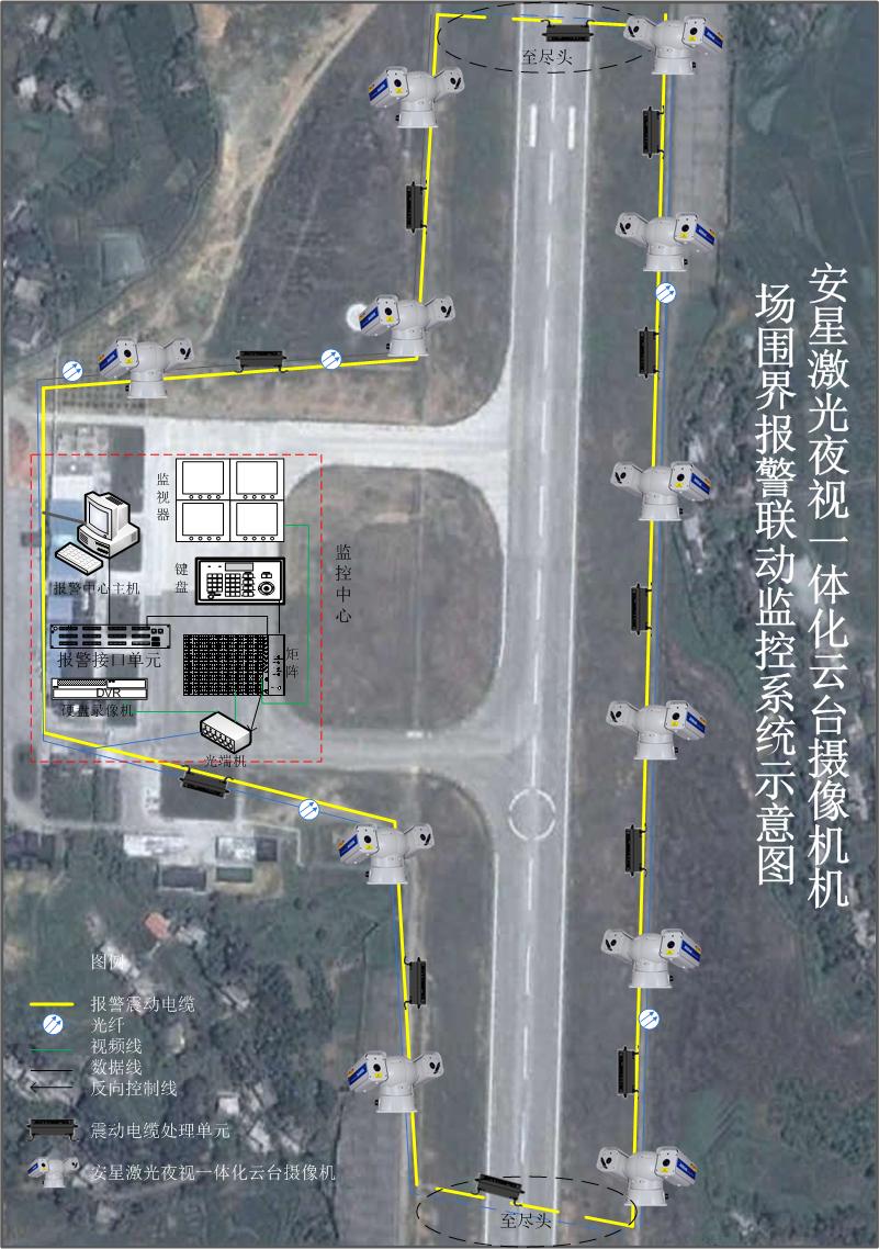 首先要考虑的问题是选择什么样的摄像机才能日夜不间断监控,如果选择普通的摄像机,则只能白天监控,一到晚上监控系统就成了瞎子,整套系统将会存在重大漏洞。如果选择普通的红外线LED摄像机,晚上只能监控到几十米的距离,如果五十米装一台摄像机,那么对于机场几公里甚至二十几公里的围界来说整套系统就会显得非常庞大,并且目前LED红外灯的实际使用寿命只有几百-两千小时(使用几个月后快速衰减),后期维护费用也非常巨大,且不说红外线摄像机效果如何(地球人都知道),所以机场监控使用普通LED红外线摄像机非常不现实。随着半导体激光器技术的成熟,使用激光主动成像夜视技术的激光摄像机的出现解决了这一问题,激光夜视摄像机具有夜视距离远、使用寿命长、夜视图像清晰的特点。安星AK-W3186激光夜视一体化云台摄像机可以夜视500-800米,满屏幕清晰监控。激光器预期寿命达到2万小时以上。集成智能化高速云台,内有预置位、巡航点、花样扫描、左右扫描、自动归位、自动运行、激光灯自动控制、同步变焦、报警输入、输出、雨刮器等实用功能,可以和周界报警系统紧密配合,实现报警联动日夜监控,快速发现非法入侵者、迅速聚焦、自动录像及快速采取措施。我们以下面是的图例来说明机场周界报警联动监控的具体实现方法。